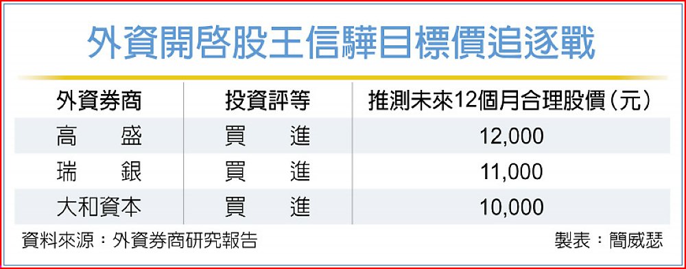 外資對股王展開目標價追逐,向來與台股行情有密不可分關係,回顧大立光2017年創當時6字頭天價紀錄,以及2019年時,都曾引發外資圈一片競相堆疊目標價,股王的強勢表現,亦激勵多頭士氣,帶領加權指數有所表現。本次股王信驊於萬元關卡前徘徊,外資對股價預期想法益發樂觀,可望成台股前景風向球。