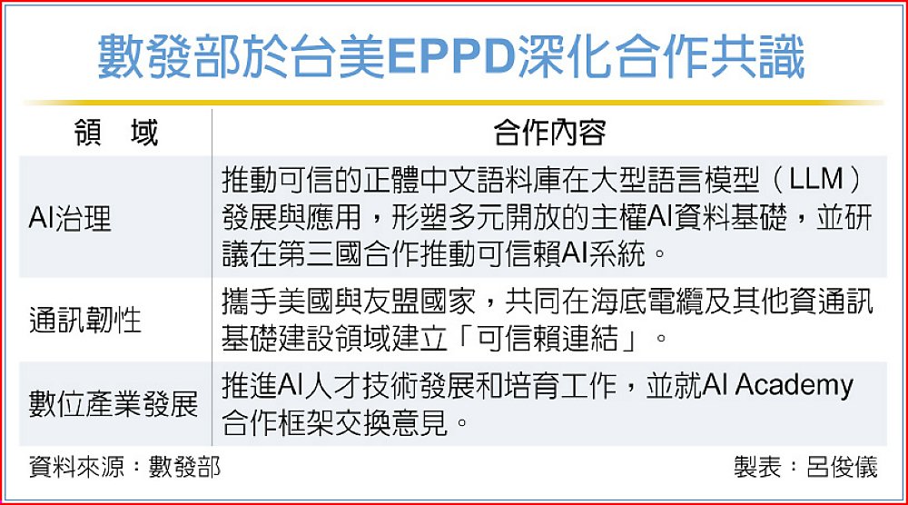 第六屆台美「經濟繁榮夥伴對話」(EPPD)落幕,數發部2日表示,與美方高階官員就AI治理、通訊韌性及數位產業發展等多領域達成深化合作共識,其中,在主權AI的繁體中文語料庫部分,雙方將研議在第三國合作推動可信賴AI系統。