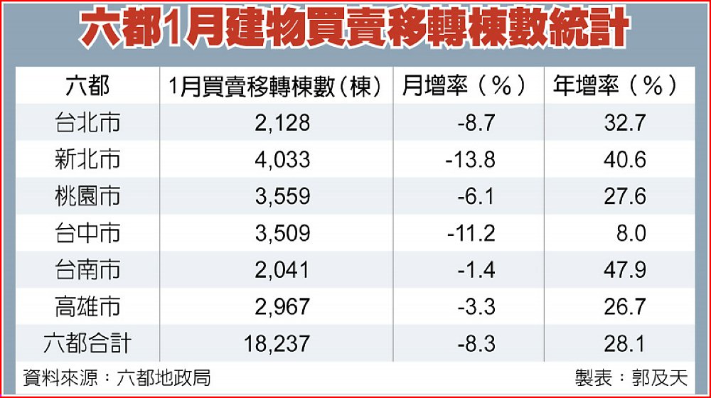 統計顯示,六都1月買賣移轉棟數同步較去年12月衰退,其中以新北、台中衰退逾1成較大。與去年同期相較,以新北、台南年增逾4成較明顯,反映台南永康、歸仁、安平等區受惠南科周邊新案交屋,撐住基本盤;新北市則因板橋、三重等第一環行政區重劃區進入交屋高峰期,帶動移轉量能。