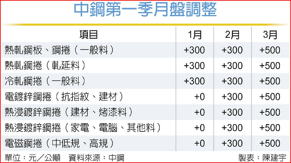 中鋼指出,全球鋼市朝正向發展,下游供應鏈紛積極回補庫存,為順應國際行情走勢並反映煉鋼成本上漲壓力,因此3月月盤產品全面調漲。