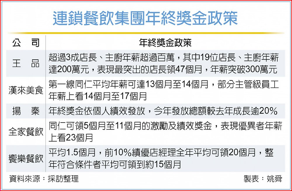 台灣「食」力驚人,去年餐飲業總營業額達1兆674億元新高,年增2.9%,王品、揚秦、全家國際餐飲、饗樂餐飲、漢來美食等連鎖餐飲集團全年業績亦創高,豪發年終獎金酬謝員工,其中王品有店長領到47個月、合計超過300萬元薪資與獎金,堪稱業界最狂。