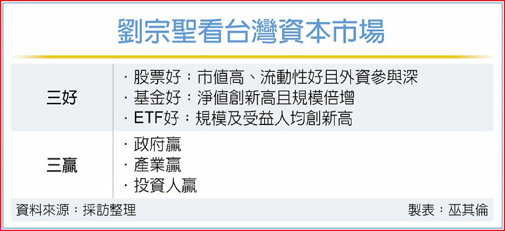 劉宗聖總結,台灣資本市場有「三好三贏」,一是股票好,市值高、流動性好且外資參與深;二是基金好,淨值創新高且規模倍增;三是ETF好,規模及受益人均創新高。因此,也達成政府贏、產業贏、投資人贏的三贏結果。