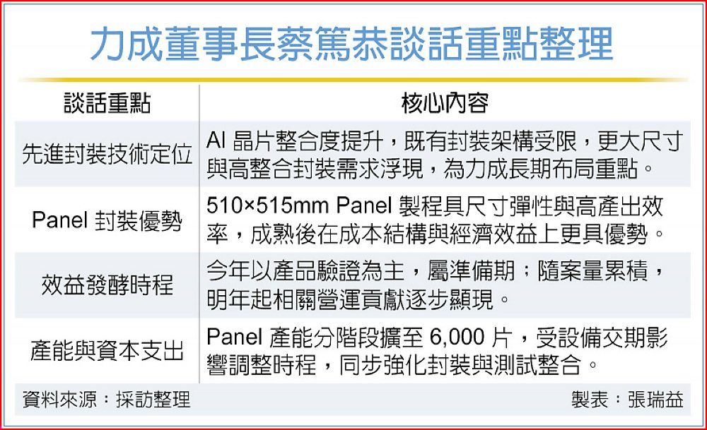 蔡篤恭指出,力成目前採用510×515毫米的大尺寸Panel製程,與傳統以圓形晶圓為基礎的封裝方式不同。公司指出,Panel封裝不僅能支援更大面積與更高密度的設計,也更適合多晶片、Chiplet與複雜嵌入式結構,對於未來高階AI晶片與異質整合應用具備更高彈性。