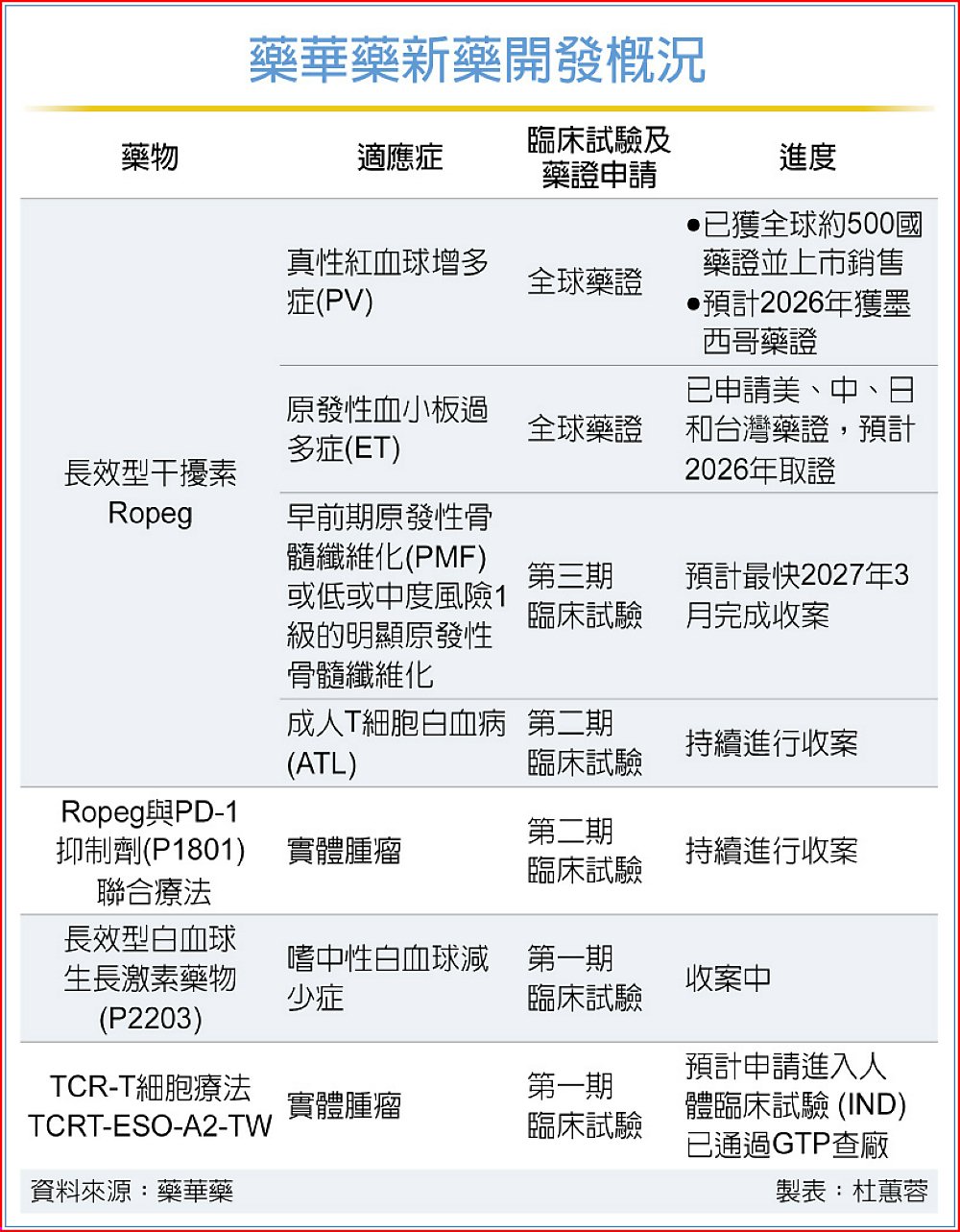藥華藥自行研發製造的創新長效型干擾素Ropeg生物藥劑,已獲全球近50個國家核准,用於成人真性紅血球增多症(PV)治療,涵蓋美國、日本、中國及歐盟等主要新藥市場,現階段由台中廠負責生產、供應全球。另新建竹北廠工程進度順利,預計今年投產,完工後整體產能可支應全球逾10萬名患者需求。