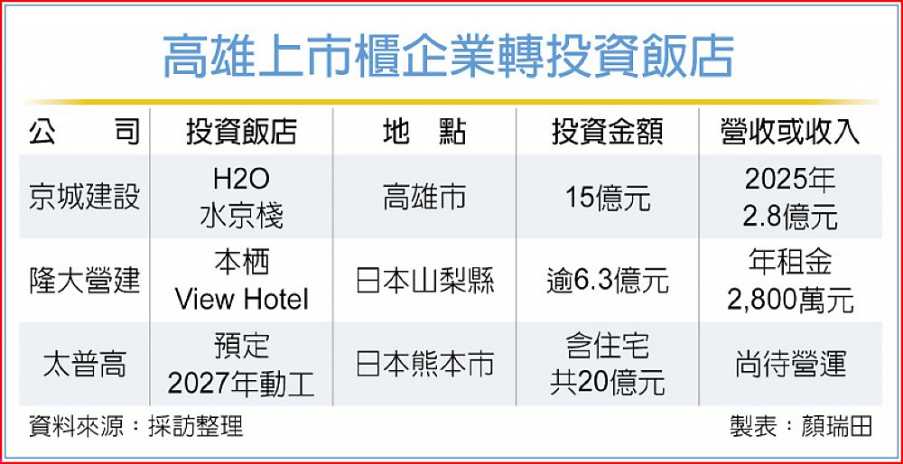 高雄上市櫃企業跨足飯店產業,藉此創造穩定金流並提升企業品牌形象,隆大、京城建設分別轉投資本栖View Hotel、H2O水京棧,從事印刷版材的太普高,也將轉投資觸角跨進日本熊本,在台積電熊本廠附近購地投資興建飯店,爭取熊本半導體產業鏈商機。
