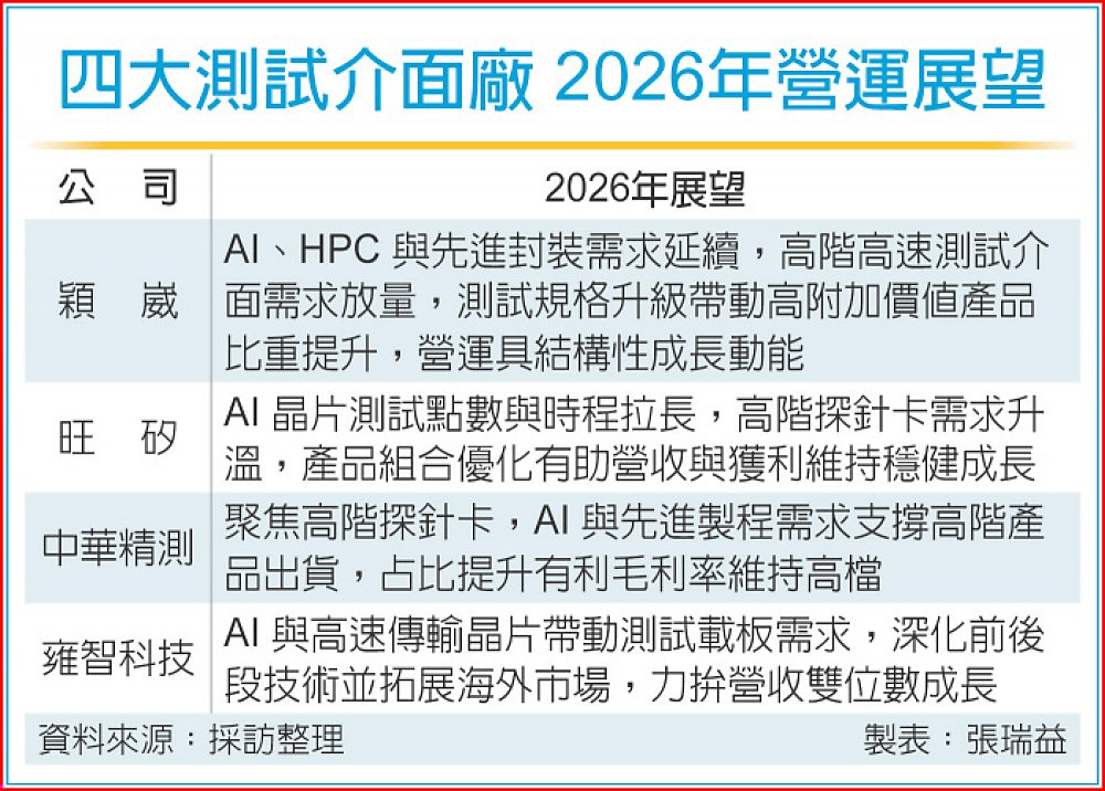 以穎崴來看,受惠AI與HPC需求延續,高階探針卡與先進封裝相關測試介面需求持續放量。