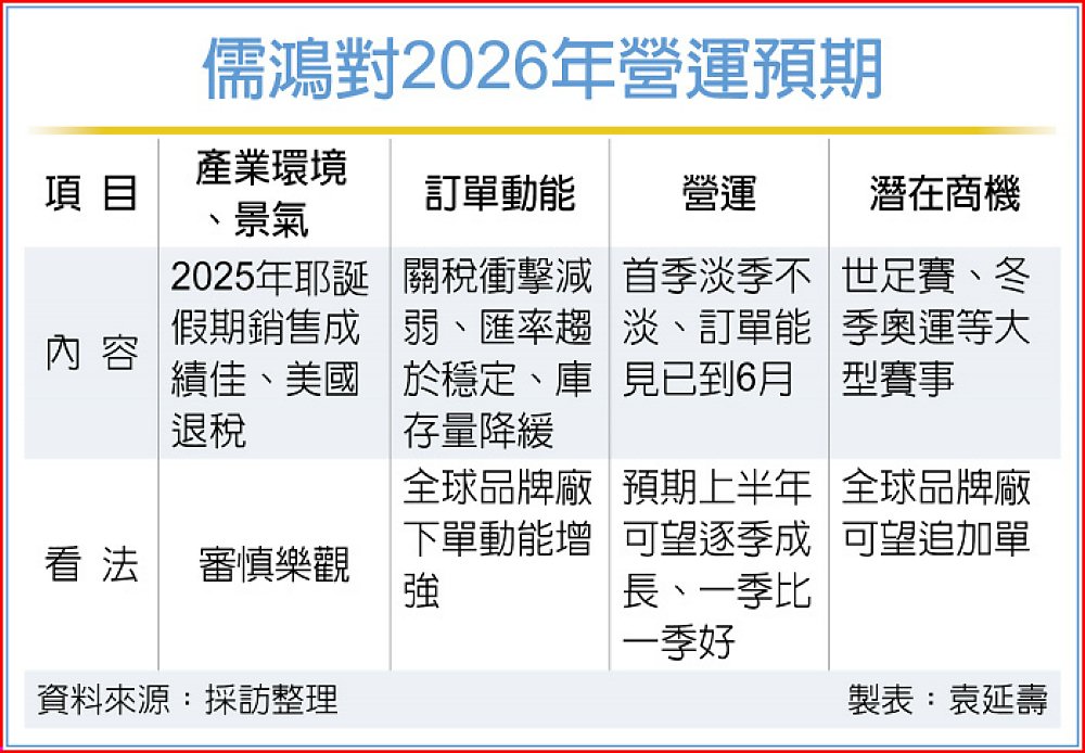 儘管第一季進入產業傳統淡季,又逢農曆新年長假、工作天數較少,儒鴻指出,第一季營收向來會比前一年的第四季下滑,但觀察目前客戶下單情況不錯,加上去年12月船期遞延的營收加持,樂觀第一季營收可較上季持平甚至微幅成長,呈現淡季不淡。
