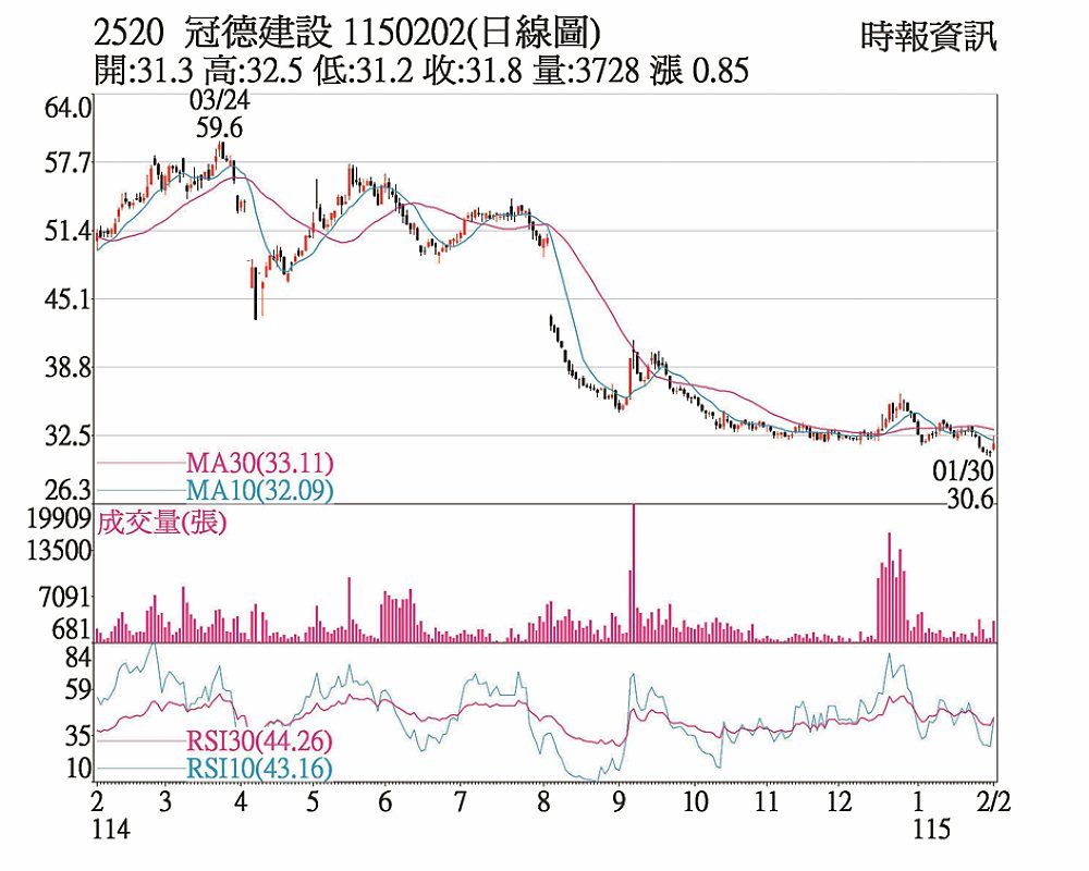 冠德(2520)今年業績不看淡,2日在台股一片綠油油中逆勢攻高,股價收31.80元,漲幅2.75%,日K值自低檔區向上穿越D值呈黃金交叉向上。成交量3,728張,其中外資、自營商即買超1,090張。