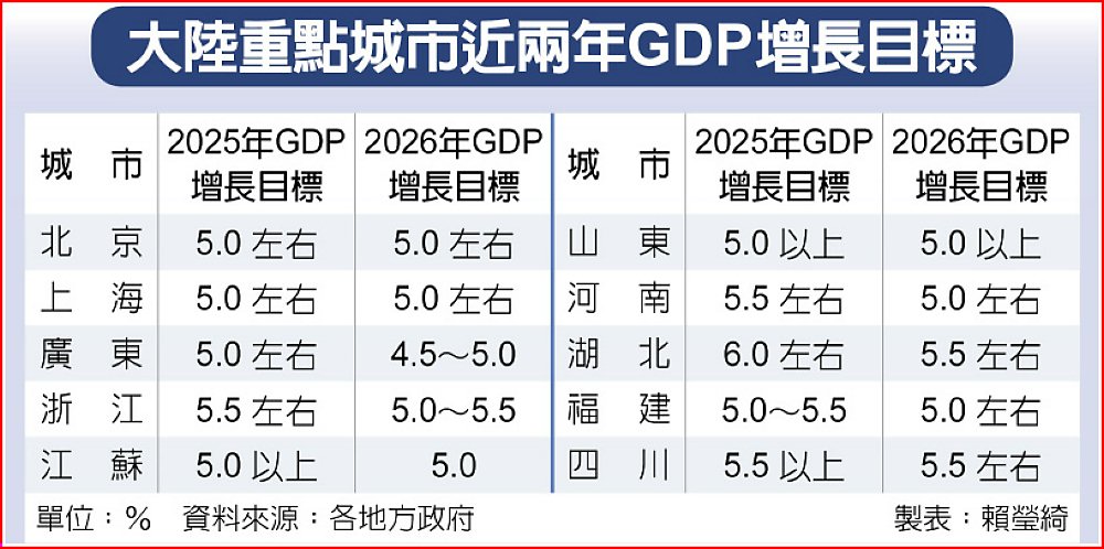 分析指出,前十大經濟省份的GDP目標之所以引人關注,主要是雖僅占全大陸近2成的土地面積,卻貢獻了超6成的GDP總量,且前三大經濟省份的GDP增速目標也與全國增速目標高度趨同。因此,2026年經濟大省的增長目標,也成為外界預估2026年全國增速目標的重要參考。