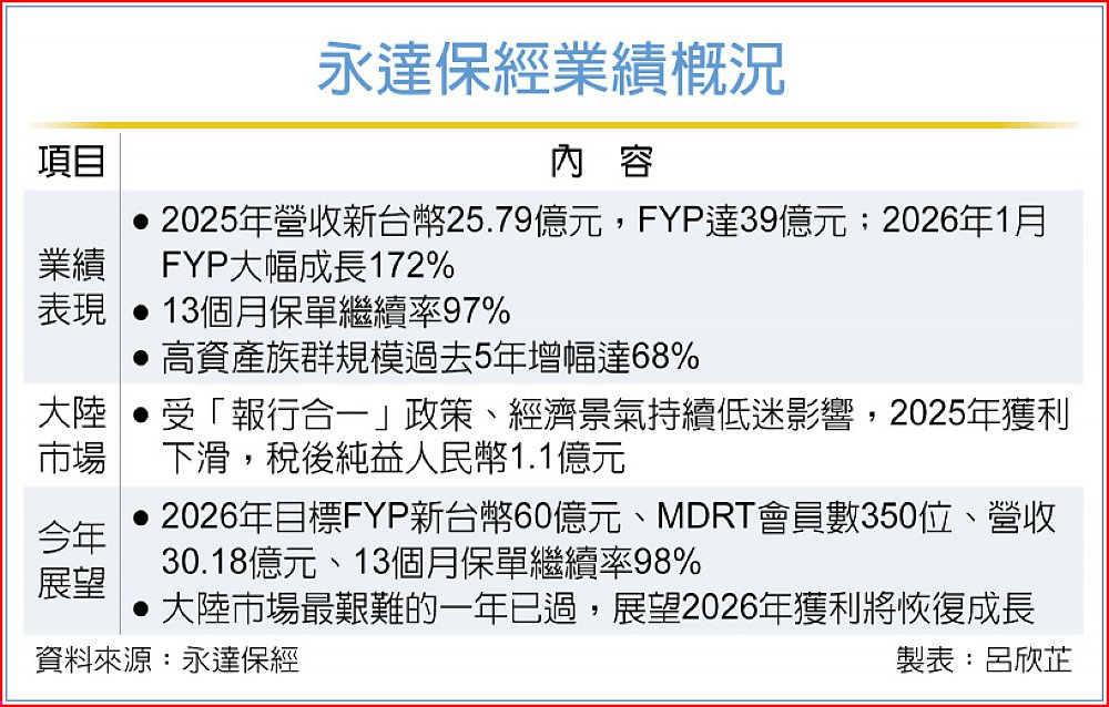 吳文永說,受大陸2024年4月推出「報行合一」(保險公司應嚴格執行經備案的保險條款和保險費率,確保備案內容與實際經營行為完全一致)政策、經濟景氣持續低迷等影響,永達保經轉投資且持股24.9%的大陸永達理保經,獲利因此下滑,但2025年稅後純益仍有人民幣1.1億元,台灣獲利表現已超越大陸市場。