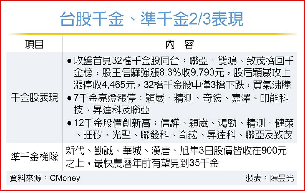 進一步觀察,台股目前準千金梯隊、900元俱樂部中,新代雖在3日跌出千金之列收996元,但最容易重返千金價位,曾登千元的勤誠、華城、漢唐及旭隼等3日也同步收漲,亦可望重返千金地位,最快農曆年前有機會見到台股35千金同框。