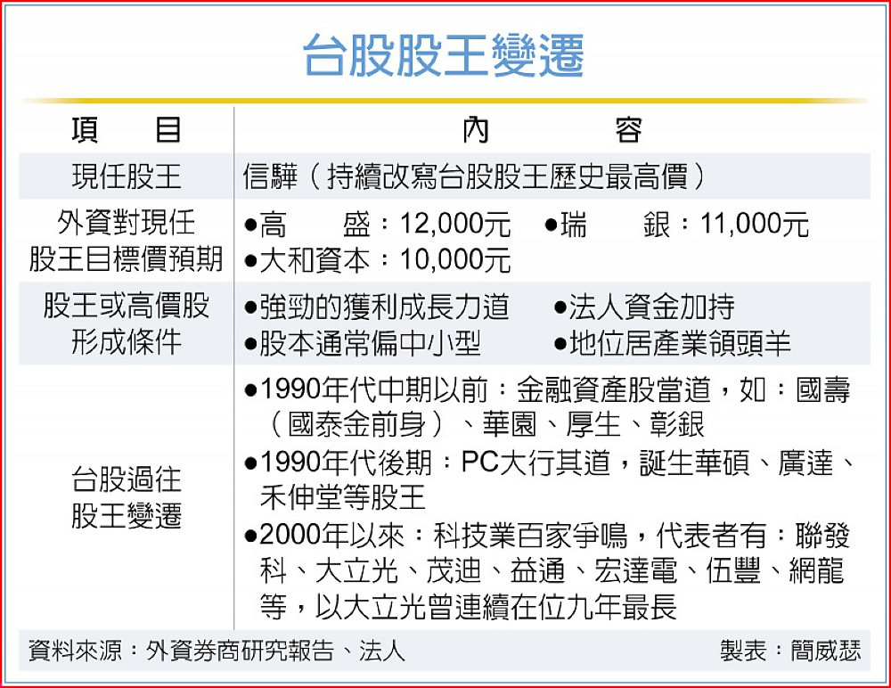 信驊持續將股王股價紀錄推高,內外資研究機構目標價也是不斷刷新高度,像大和資本、瑞銀、高盛、凱基投顧、金控旗下投顧等,賦予的股價預期都在10,000~12,000元間。