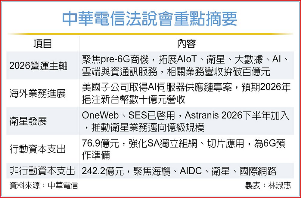外資法人關注2026年非行動資本支出242.2億元年增24.2%的投資方向,財務長許文馨表示,中華電信計劃擴大國內外海纜建設、多軌衛星網路、擴建雲端AIDC機房中心。而行動資本支出76.9億元,財務處副總蔡卓芬強調,會加強在SA獨立組網應用例如切片發展,為布局6G預作準備。