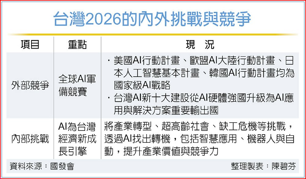 葉俊顯在國發會年終記者會上指出,國家政策要能領航台灣邁向未來,將以「AI新十大建設」作為國家AI發展核心引擎,推動生活、產業、政府AI。然而,各國近年透過政策大力鋪陳AI計畫,全球進入「AI軍備競賽」,「好像少花一點錢就會落後別人」,如美國推動AI行動計畫,重塑產業鏈與國際規則領導地位,歐盟AI大陸行動計畫、日本人工智慧基本計畫,韓國AI行動計畫等,均為國家級AI戰略。