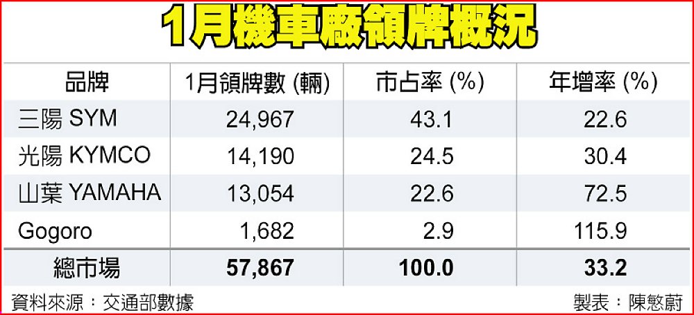 觀察1月各廠表現,三陽續穩居國內機車龍頭,1月新領牌2.5萬輛、年增22.6%,市占率43.1%。三陽統計,旗下DRGBT待交車訂單逾3,000輛。