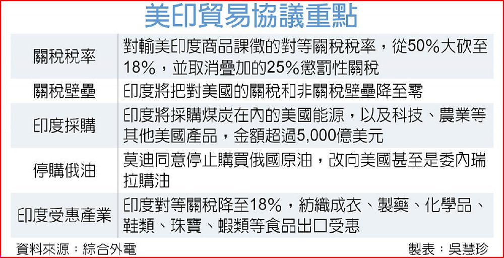 川普與印度總理莫迪通話後,於自家社群媒體宣布美印敲定貿易協議。川普表示,莫迪同意停止購買俄國原油,將改向美國甚至是委內瑞拉購油,因此印度輸美商品的對等關稅,從50%大幅調降至18%。
