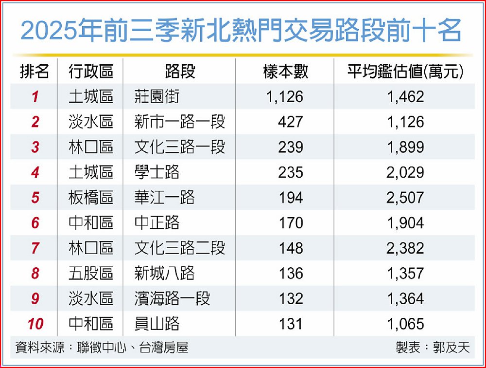 2025年房市雖冷,但新北市在剛性需求支撐下,仍維持一定能見度,其中新北前十大熱門交易路段多位在重劃區,最熱門為土城區「莊園街」逾千件交易奪冠,其次為淡水新市一路一段、林口文化三路一段。