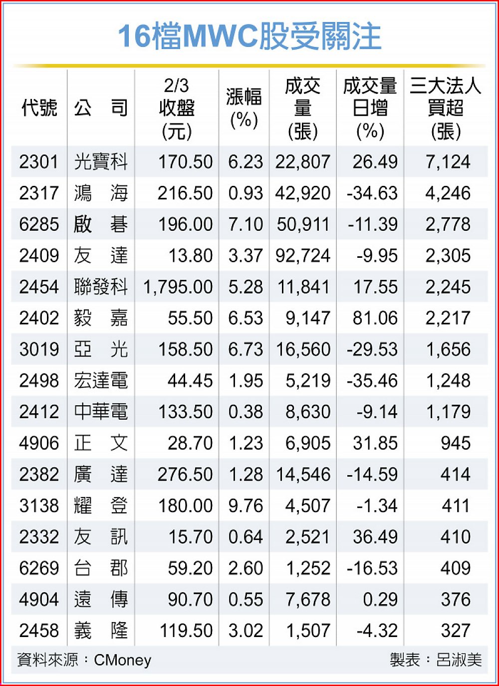 進一步篩選相關題材股,獲得三大法人3日買盤卡位有光寶科、鴻海、啟碁、友達、聯發科、毅嘉、亞光、宏達電、中華電、正文、廣達、耀登、友訊、台郡、遠傳、義隆等,買超都各在300張以上。