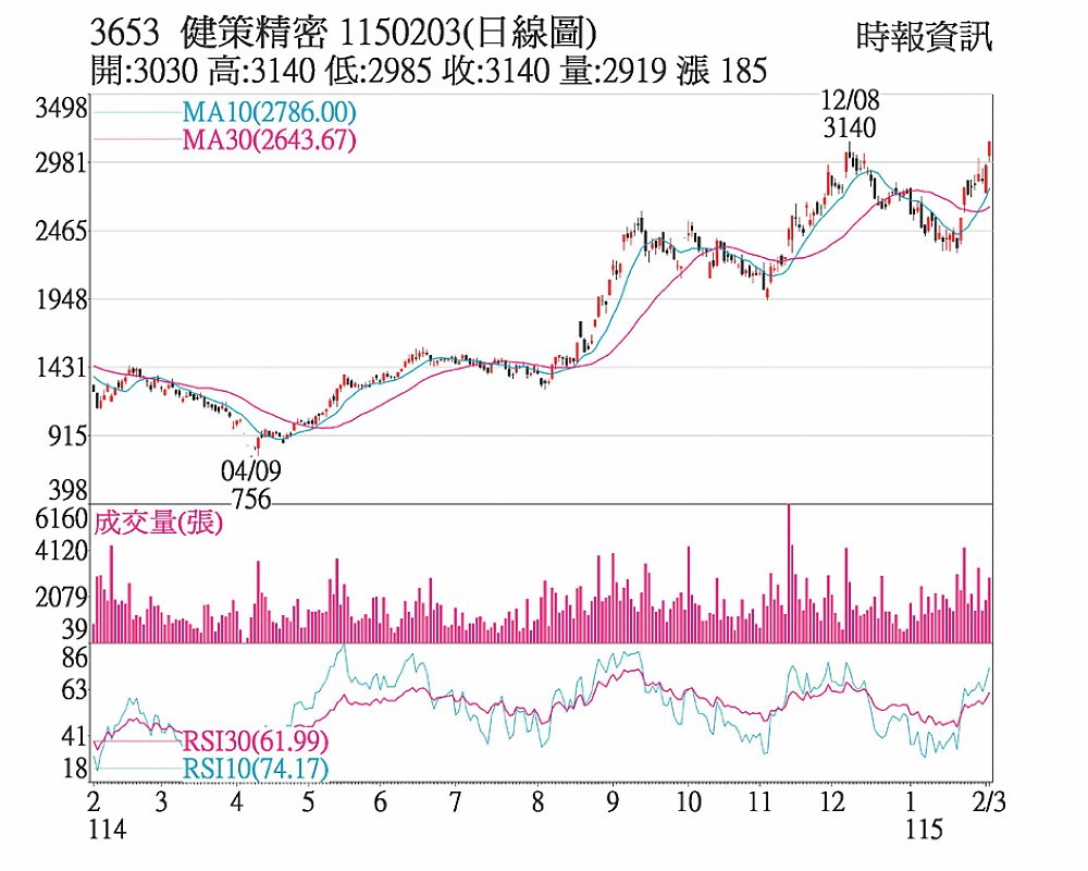 健策(3653)3日以3,030元跳高開出後,持續震盪向上,終場收在3,140元、漲幅達6.26%,追平前波歷史新高價位3,140元;近期大盤逢高震盪壓回,惟健策力守短、中期均線之上,且成交量未出現暴增,量能維持在2,705張,仍有穩步盤堅機會。