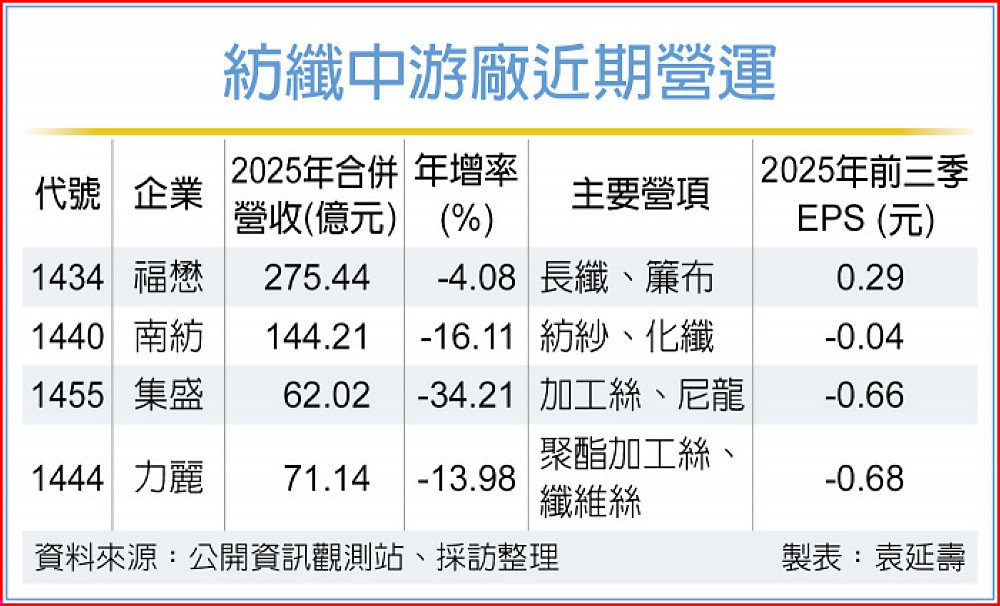 紡纖中游廠透過積極調整產品結構、減量經營規格化紡品,以及精實高值化、創新產品的生產策略,包括福懋(1434)、南紡(1440)、力麗(1444)、集盛(1455)均認為整體產業環境已有改善,預期今年營收、獲利可較去年提升。