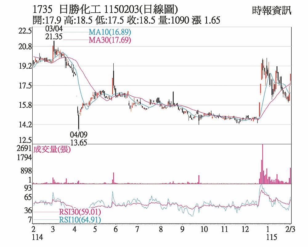 日勝化(1735)3日因外資與自營商聯袂買超,股價開高走高,上午9時7分攻上漲停鎖死,隨後打開後又鎖住,直至10時11分,因賣壓顯現,漲停打開,股價下跌震盪整理,上午11時37分,因主力買超,股價再度攻上漲停價,鎖死至終場,收18.5元,上漲1.65元,成交量1,090張。