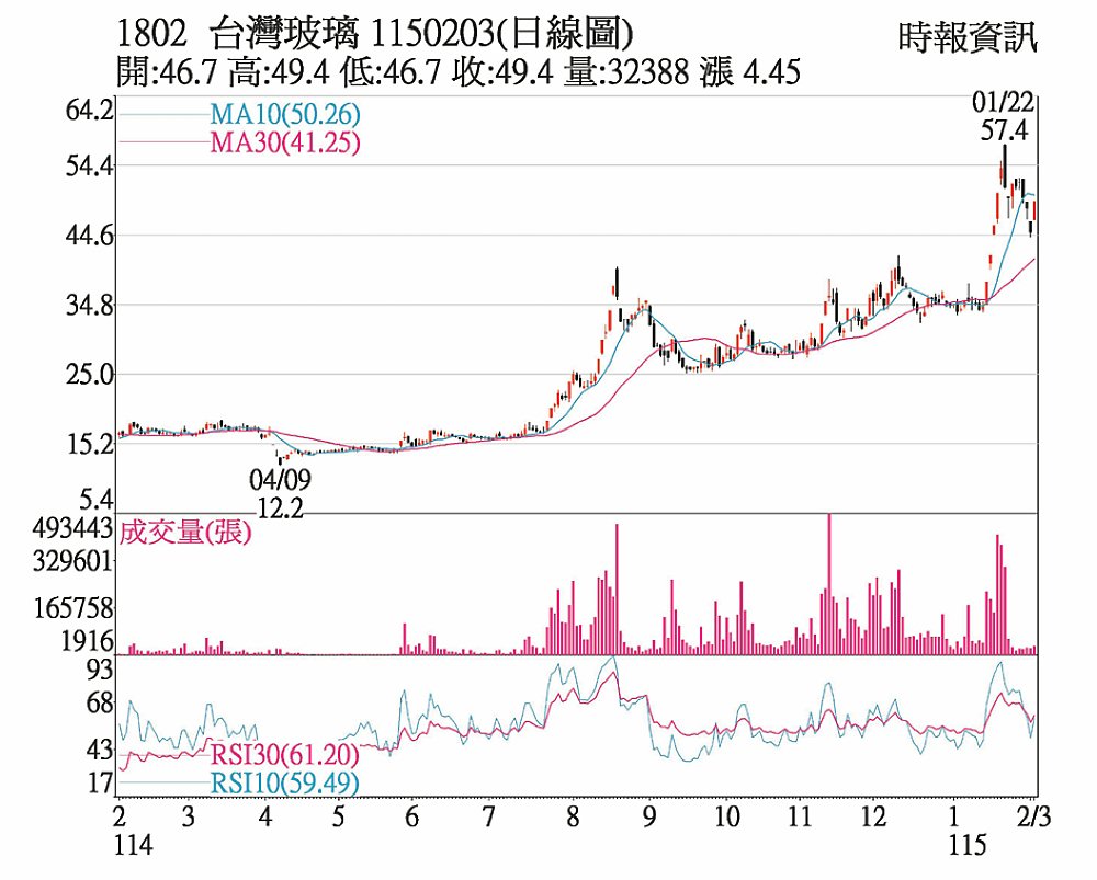 台玻(1802)受惠電子級玻纖布訂單滿滿,轉虧轉盈,吸引中長期買盤及當沖力挺,加上近期股價回檔不破季線,短線強勢反彈,3日股價收漲停49.4元,已站穩短期月線之上,5日均線下滑趨勢幅度已收斂有反轉跡象,9日K線趨勢已轉緩,各短線技術指標雖仍呈短空排列,不過在量能有增溫趨勢,短線視為跌深反彈,近期股價可望重新向50元關卡挑戰。