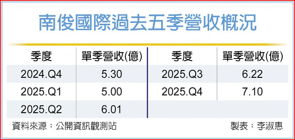 南俊2025年第四季營收7.1億元,繳單季營收歷史新高佳績,季增14.15%、年增33.96%,以其營收進度推估,法人推算南俊去年第四季EPS可望挑戰2.7元,2025年獲利將突破半個股本,上看5.7元,以元月營收來看,法人預期,月營收3億元成為基本盤,首季有望挑戰8億元,續創單季新高,據此推估南俊2026年營收將大幅成長超過四成,全年度獲利可望挑戰15元。