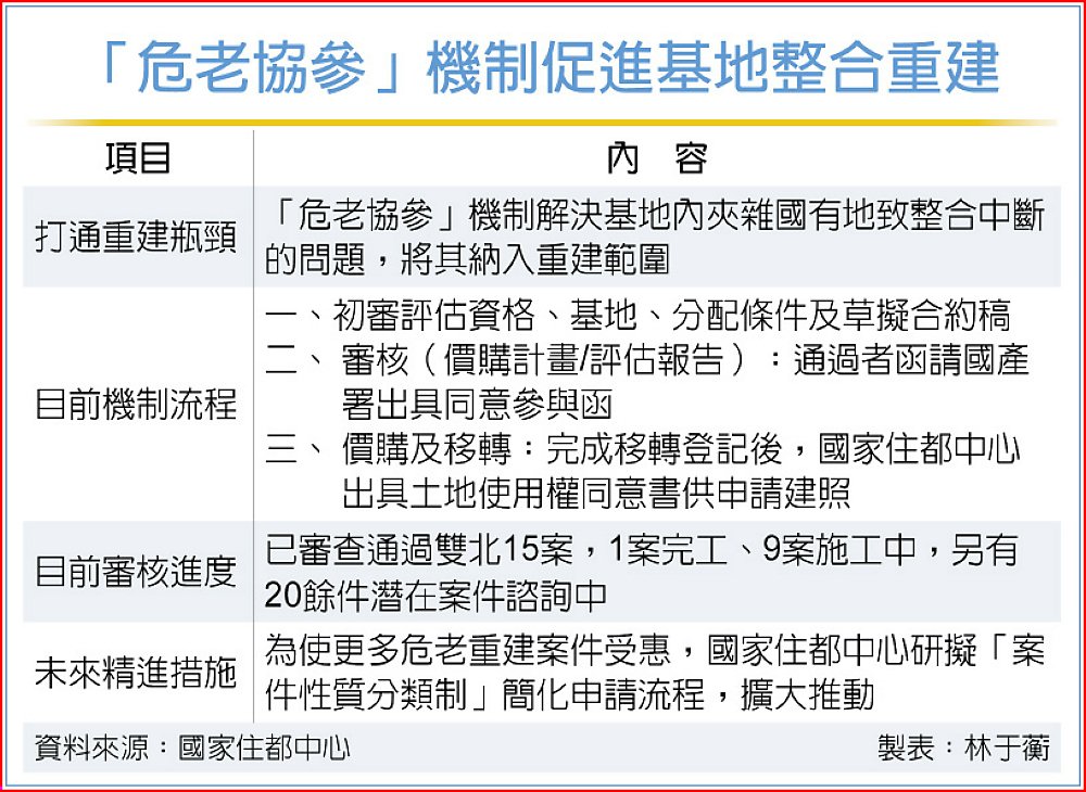 國家住都中心說明,民間過去推動危老重建時,常因基地內夾雜國有地導致整合中斷,透過國家住都中心與國產署合作的「危老協參」機制,規範國家住都中心價購國產署管有之國有非公用土地及建築物參與危老條例重建,可協助解決重建計畫範圍內國產署管有之國有非公用土地及建築物參與之困境。