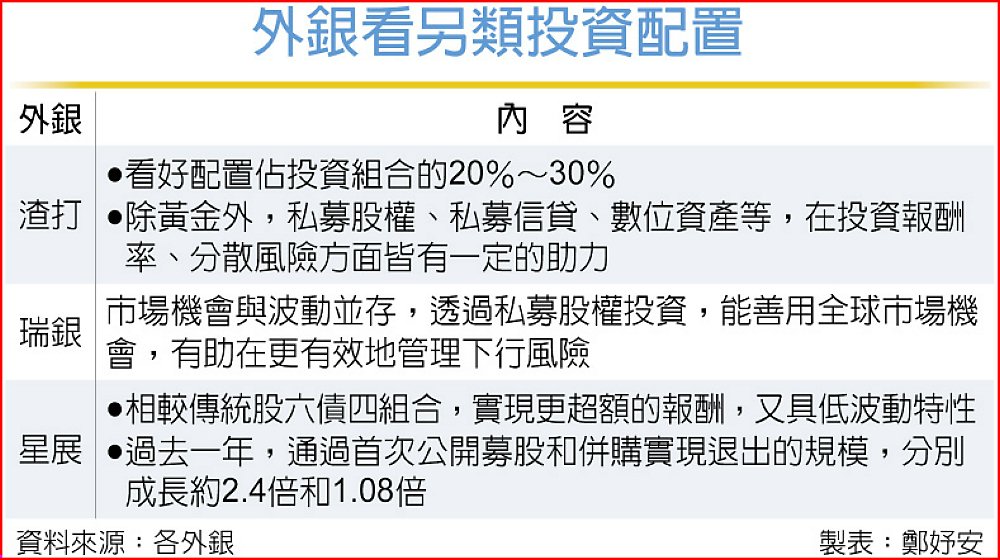 渣打銀行財富方案全球首席投資總監布思哲(Steve Brice)看好將另類投資布局占投資組合20%~30%,除黃金外,私募股權、私募信貸、數位資產等,在投資報酬率抑或分散風險方面,皆有一定的助力。