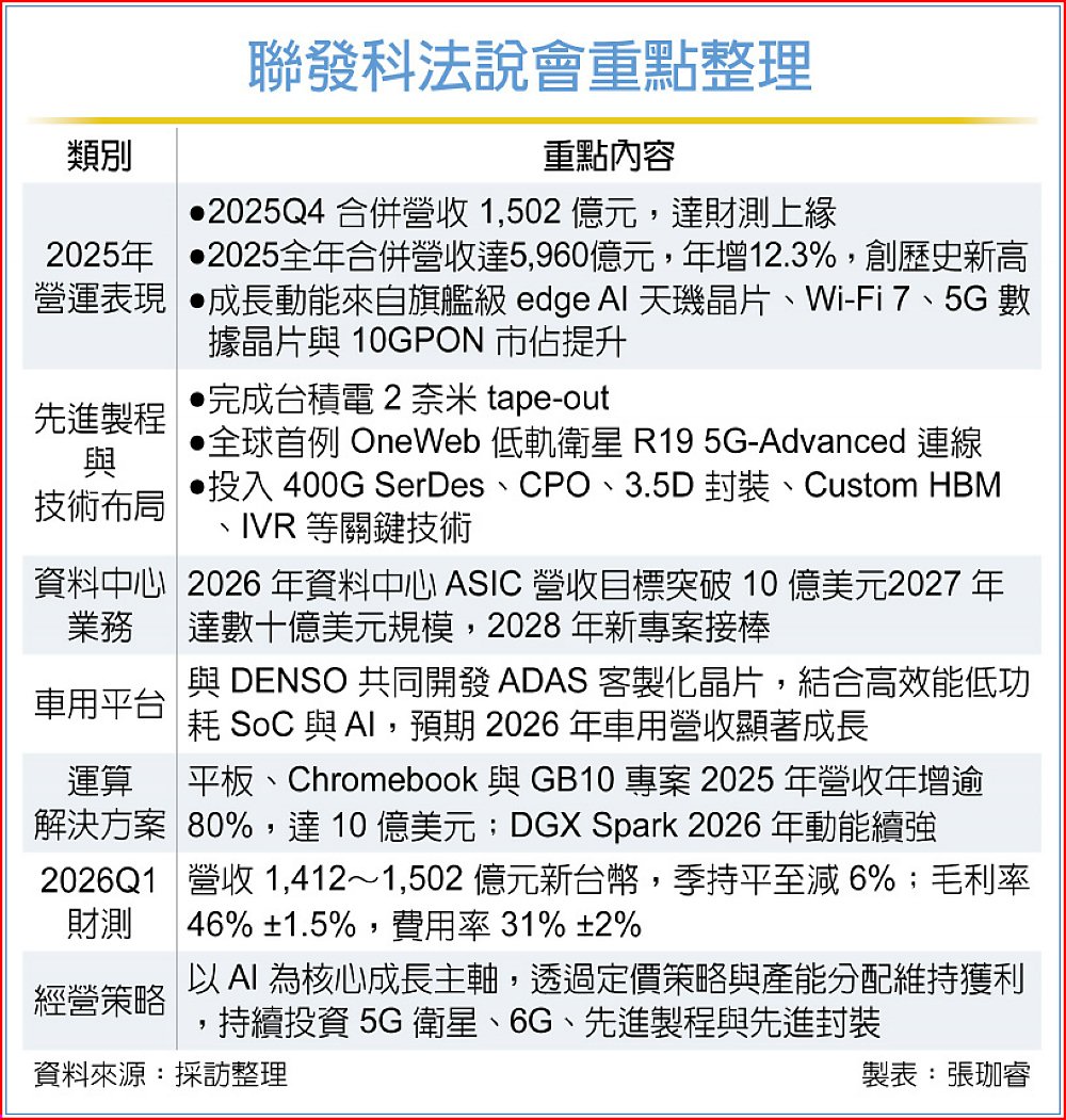 聯發科4日舉行法說,2025年第四季合併營收為1,502億元,達財測目標上緣,毛利率受到產品組合影響為46.1%,單季每股稅後純益(EPS)14.39元;然2025年合併營收5,959億元再寫歷史新高,EPS達66.16元。預估今年首季合併營收將介於1,412億元至1,502億元之間,呈持平至季減6%。