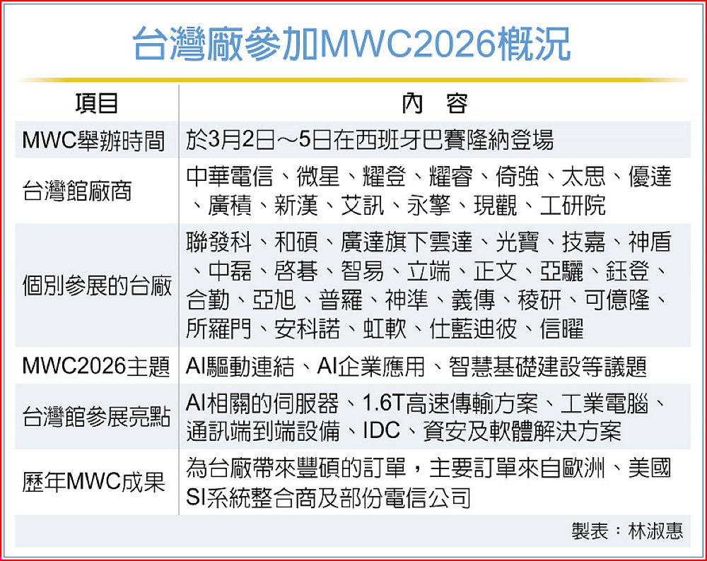 歷年MWC展覽都為台廠帶來豐碩訂單,經濟部統計主要訂單來自歐洲及美國SI系統整合商及電信公司。MWC 2026主題聚焦AI驅動連結、AI企業應用、智慧基礎建設等議題,今年被視為AI應用真正「落地」,潛在商機龐大,有機會促成國際廠商下單台廠。