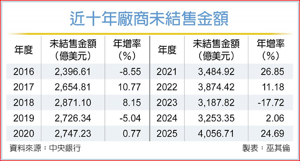 央行長期以來的統計數據,過去年度廠商未結售規模,大多在2,500億~3,500億美元之間,去年一舉衝上4,000億美元以上為史上首見,超越2022年的數據創下歷史新高紀錄。
