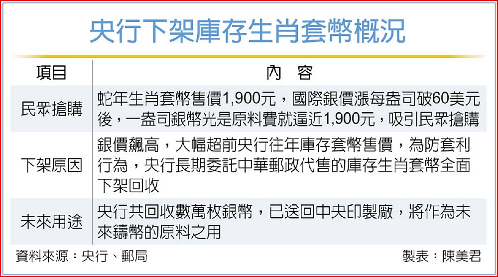 白銀價格漲太凶,中央銀行往年發行的生肖套幣出現套利空間,中央銀行緊急出手,長期委託中華郵政代售的庫存生肖套幣,已全面下架回收;據悉,央行共回收數萬枚銀幣,並已送回中央印製廠,將作為未來鑄幣的原料之用。