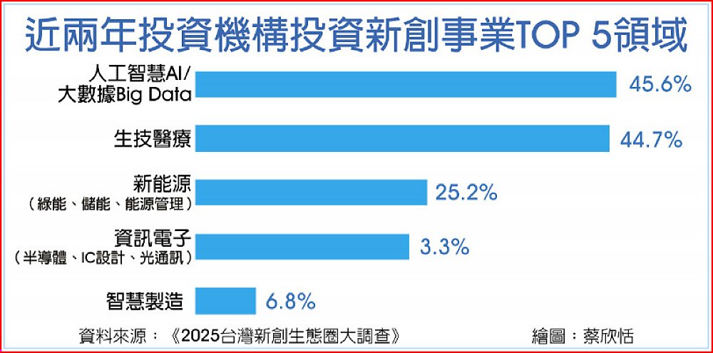 《2025台灣新創生態圈大調查》顯示,創投機構過去兩年投資AI相關主題新創的資金規模落在新台幣1億元(含)以下的占比超過60%,平均每件投資金額6,800萬元。《2025新創趨勢投資年報》則顯示,2023~2024兩年間,AI人工智慧領域每件新創案件平均投資金額約落在1.2億元。調研團隊指出,所幸投資機構逾半數將投資聚焦於國內新創團隊,如百分之百為國內件數占比有56.4%,逾半數為國內的件數則超過80%,國內AI新創事業尚能獲得本地的注資。