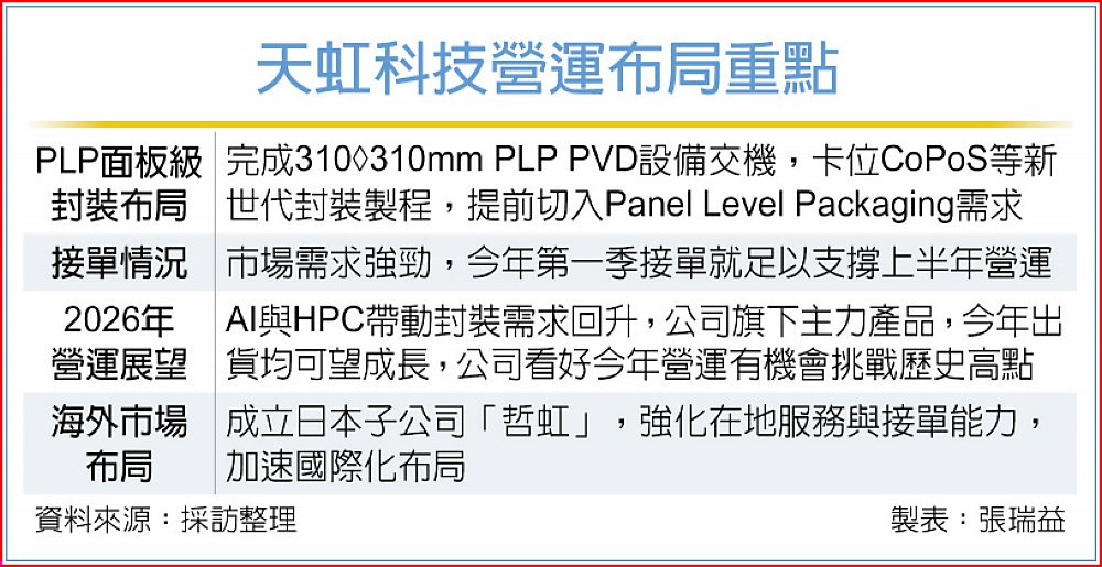 先進封裝朝大尺寸面板化發展,半導體設備廠天虹科技宣布完成310×310mm面板級封裝PLP PVD設備交機,並已導入高雄封測客戶產線,在AI帶動封裝技術升級之下,法人指出,公司在PLP與EUV兩大技術布局逐步進入收割期,隨新接訂單與遞延出貨挹注,2026年營運可望回到成長軌道,全年營收挑戰歷史新高。
