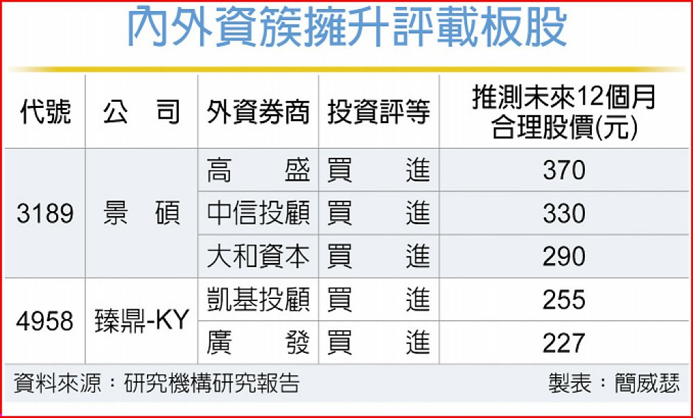 內外資鎖定升評的景碩與臻鼎-KY,4日雙雙攻上漲停板,且外資機構法人籌碼極為捧場,分別買超景碩2.2萬張、臻鼎-KY為1.9萬張,高居個股買超排行第六、第七名,族群性相當整齊。