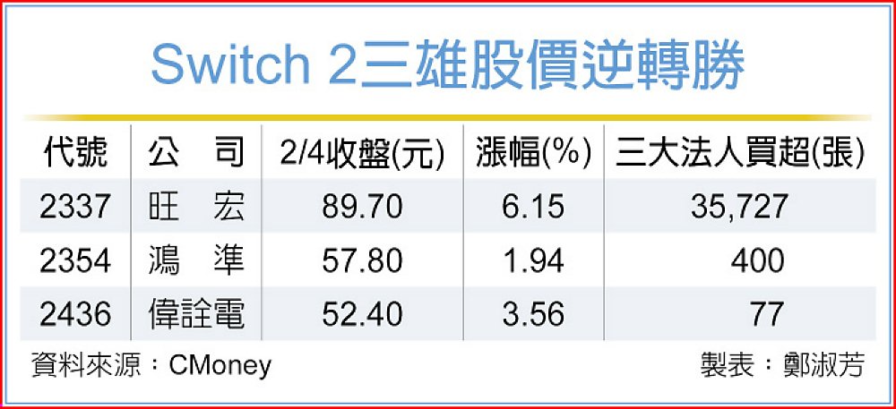 任天堂營運開紅盤,讓4日早盤陷入低盤的旺宏股價獲支撐,繼以82.8元、下跌1.7元開出後,三大法人進場布局,單日買超張數達35,727張,並居4日個股買超第三名,僅次於群創和力積電,不僅帶動股價順利翻紅,終場更以89.7元、上漲6.15%作收,不只旺宏上演逆轉秀,Switch 2概念股偉詮電4日也同步黑翻紅,盤中漲幅一度逼近半根停板,終場漲幅雖不若旺宏,但仍達到3.55%,並收在52.40元,收復所有均線。