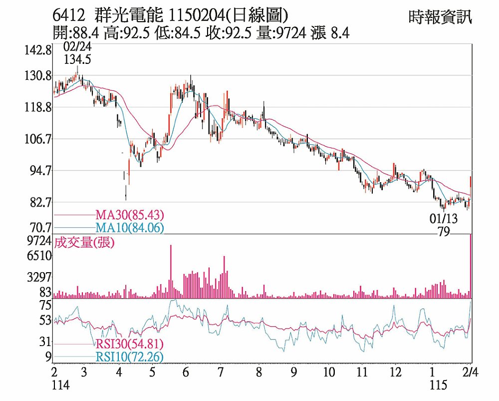 群電(6412)低檔震盪整理後展開攻勢,4日以88.4元開出,盤中多頭資金簇擁,放量攻上漲停92.5元,並一路鎖至終場,上漲8.4元,順利收復季線,單日成交量暴增至9,634張,量能同步突破近期整理區。
