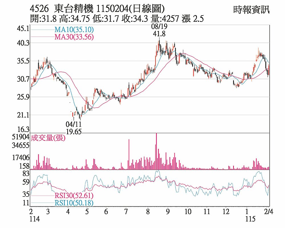 東台(4526)受惠榮田大型車床在手訂單回溫、PCB鑽孔機訂單增長,外資4日轉賣為買,買超142張,抵銷自營商調節持股賣出6張,市場承接買盤不弱,終場上漲2.50元、收34.30元,突破5日均線反壓,上檔將面臨10、20日以上賣壓。