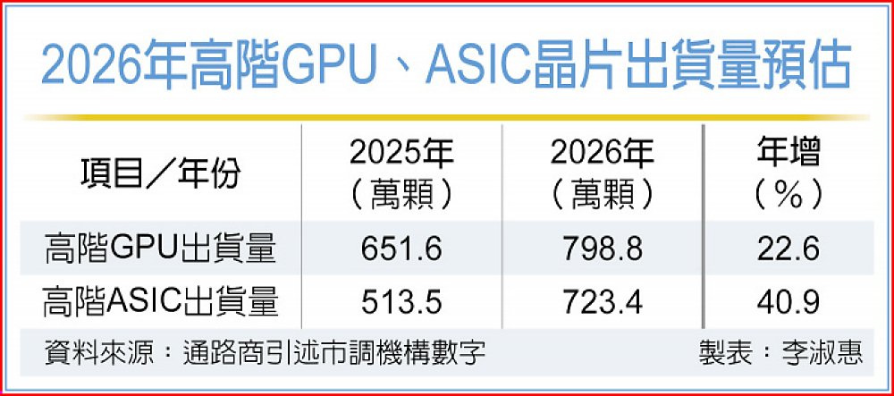 通路商引述市調機構資料,2026年高階ASIC出貨將達723.4萬顆,年增率達40.9%,而高階GPU出貨量達798.8萬顆,雖然仍是AI晶片最大宗,但以成長「幅度」來看,ASIC以40.9%超越GPU的22.6%,其中TPU晶片出貨成長幅度將衝上ASIC第一,預估從2025年的233.9萬顆大增100萬顆至332.5萬顆,年增幅上看42.1%,成長幅度超越平均數。