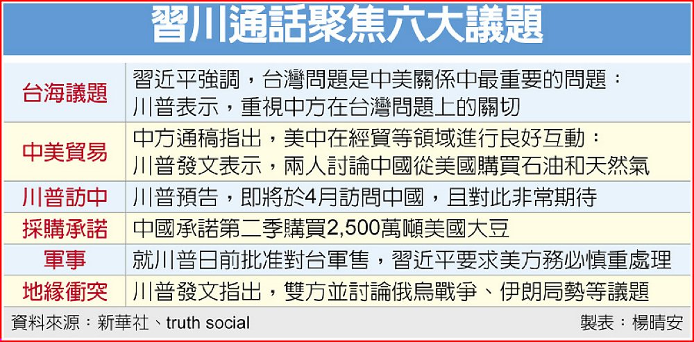 川普在通話後也於Truth Social發文指出,重申他與習近平私交良好,「這是一通內容深入、時間很長的通話」,雙方討論包括貿易、軍事、4月訪問中國之行、台灣問題、俄烏戰爭、伊朗局勢、中國從美國購買石油和天然氣,及中國考慮增購美國農產品等。