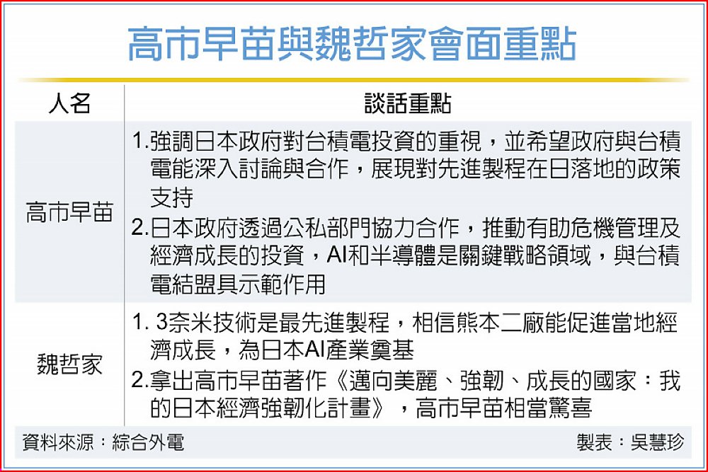 魏哲家在與川普和高市這兩場重要的會面中,發言得體且舉止落落大方,讓賓主盡歡,不失為一個國際級的商業領袖。據了解魏與川普開記者會前,兩人閒話家常半小時,且未談及投資話題,而與高市會面時,魏哲家還亮出高市著作『邁向美麗、強韌、成長的國家——我的「日本經濟強韌化計畫」』,讓高市大秀表情包。