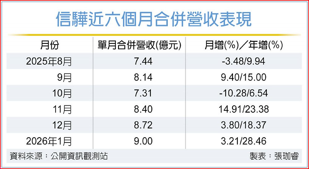 信驊今年營收持續看旺,1月合併營收達9億元,較去年同期的7.01億元成長28.46%,再寫歷史單月最高的佳績,延續AI伺服器需求成長帶動的高成長趨勢。該公司預估,今年第一季合併營收將介於26億~27億元。法人指出,年初即能維持強勁的成長幅度,顯示終端客戶對高階伺服器與系統管理晶片需求依舊暢旺。