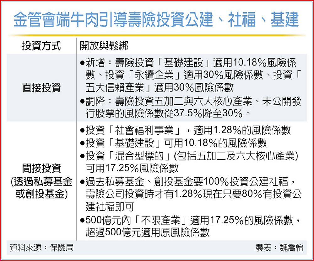 壽險「直接投資」部分也有二項開放,一是新增項目,投資基建適用10.18%風險係數、投資永續企業適用30%風險係數、投資五大信賴產業適用30%風險係數;二是調降風險係數,包括投資五加二與六大核心產業、投資未公開發行股票的風險係數降至30%。