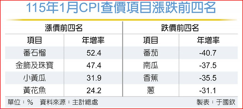 元月368個查價項目裡,漲幅(年增率)前三名是:番石榴漲52.4%、金飾及珠寶漲47.4%、小黃瓜漲31.9%,番石榴比金飾珠寶漲得更多。跌幅前三名是:蕃茄、南瓜、香蕉,皆比去年同月跌35%以上。