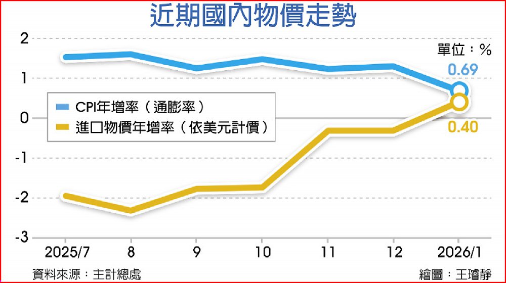 展望2月,曹志弘表示,由於2月適逢春節,在農曆年節影響下,估計通膨率會升至2%左右,1~2月平均仍在1.3%~1.4%,國內物價仍舊平穩。