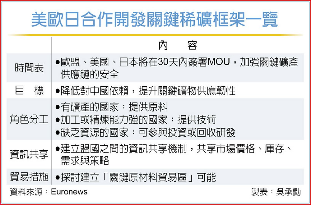 為了應對中國在稀土與其他關鍵原材料市場的主導地位,美國、歐盟以及日本4日發表聯合聲明,將在未來30天內簽署合作備忘錄(MOU),強化關鍵稀有礦物供應的安全。