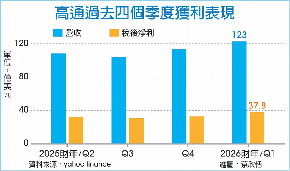 高通4日發布2026財年第一季財報,公司繳出亮眼成績,單季營收達123億美元,非通用會計準則(Non-GAAP)每股盈餘為3.50美元,雙雙創下新高;其中,QCT(晶片業務)營收達106億美元,汽車業務營收年增15%,至11億美元,同樣創下歷史新高,顯示非手機業務持續成長。