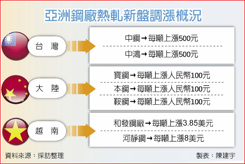 越南河靜鋼4日宣布交期在3~4月的熱軋每噸漲價8美元,線材每噸則漲10美元後,中鴻5日接力開盤,包括熱、冷軋及鍍鋅每噸皆漲500元。隨著越南河靜鋼、中鴻開高盤,宣告亞洲主力鋼廠全面漲價,鋼市「開門紅」態勢確立。