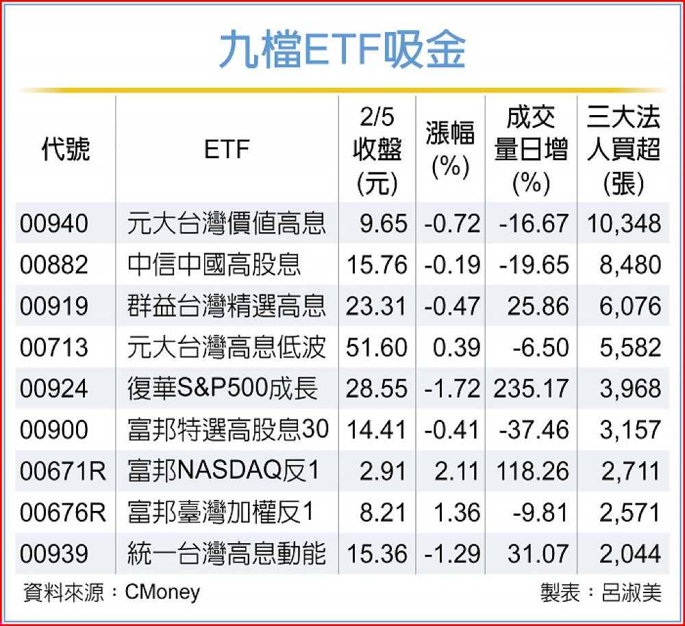 據統計,三大法人5日買超2,000張以上、與各國股指連動的ETF共有九檔,包括元大台灣價值高息、中信中國高股息、群益台灣精選高息、元大台灣高息低波、復華S&P500成長、富邦特選高股息30、富邦NASDAQ反1、富邦臺灣加權反1及統一台灣高息動能等。